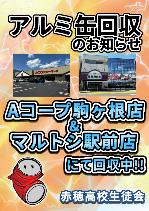 - 赤穂高校生徒会では、鈴蘭祭の資金を集めるために、アルミ缶回収を行っています。ご協力お願いします。