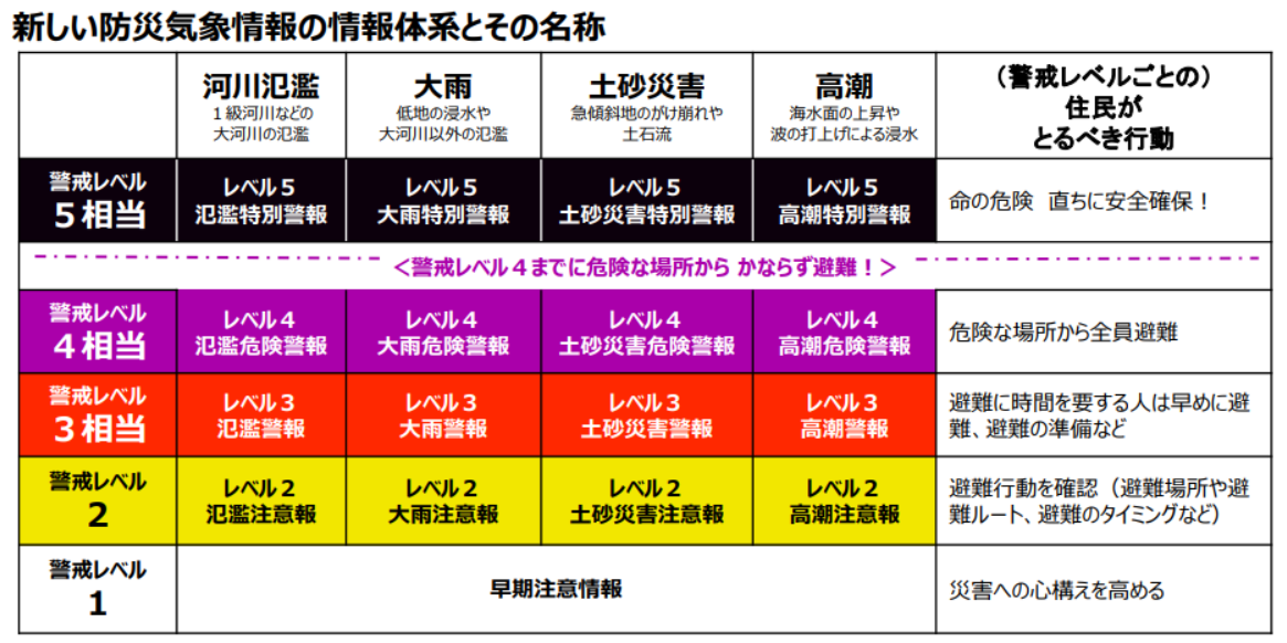 - 防災気象情報(河川氾濫、大雨、土砂災害、高潮)を5段階の警戒レベルに合わせて発表。