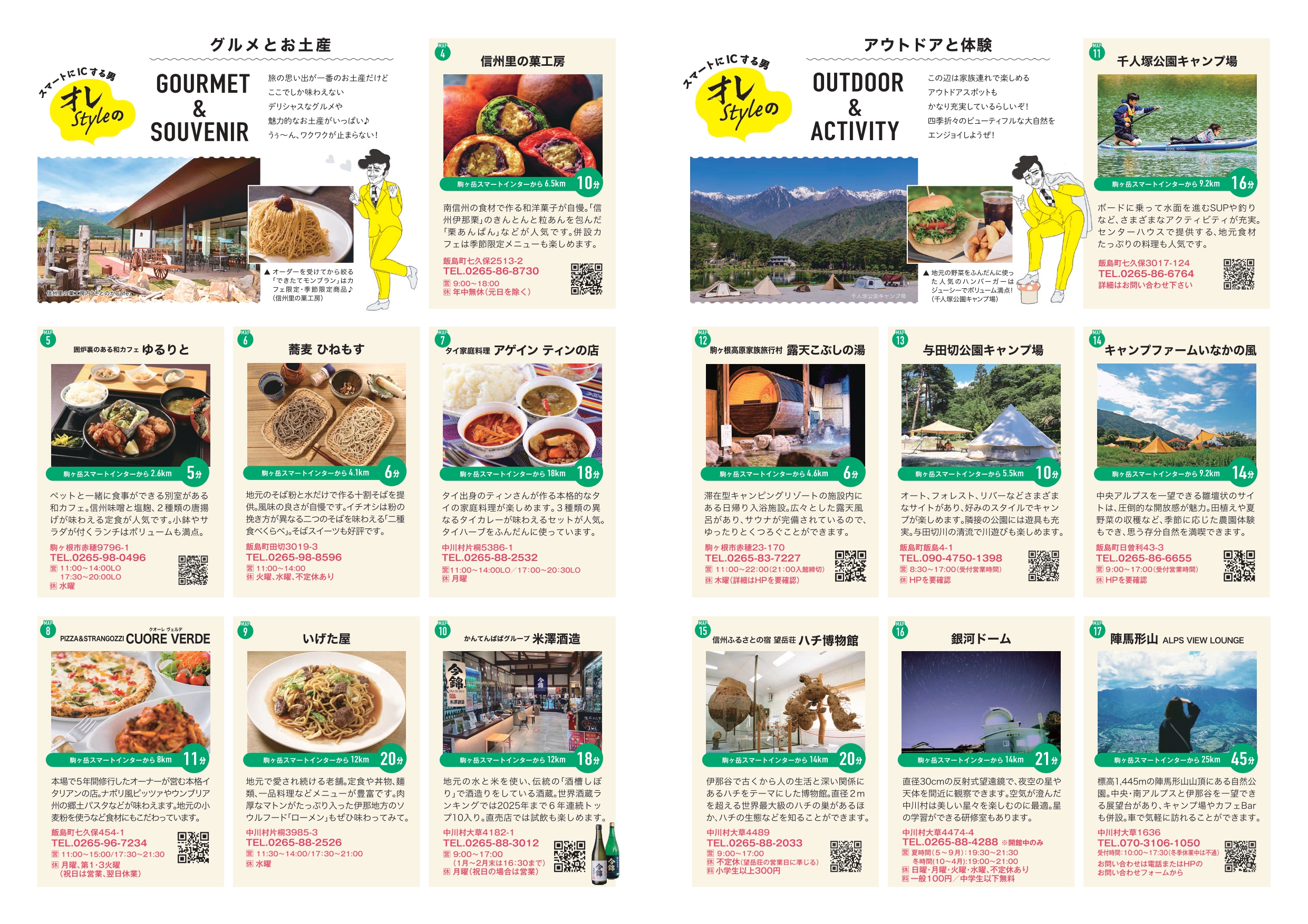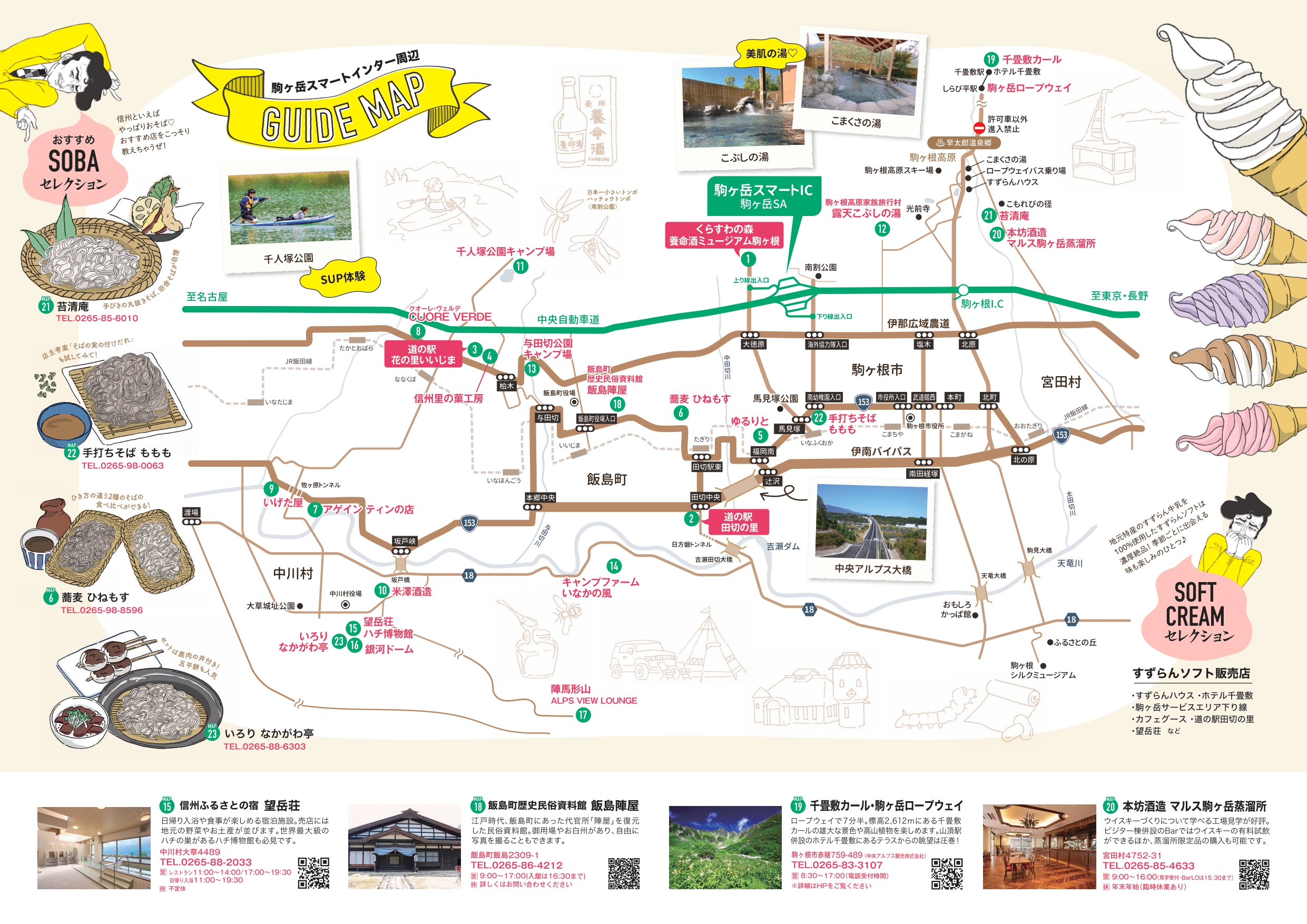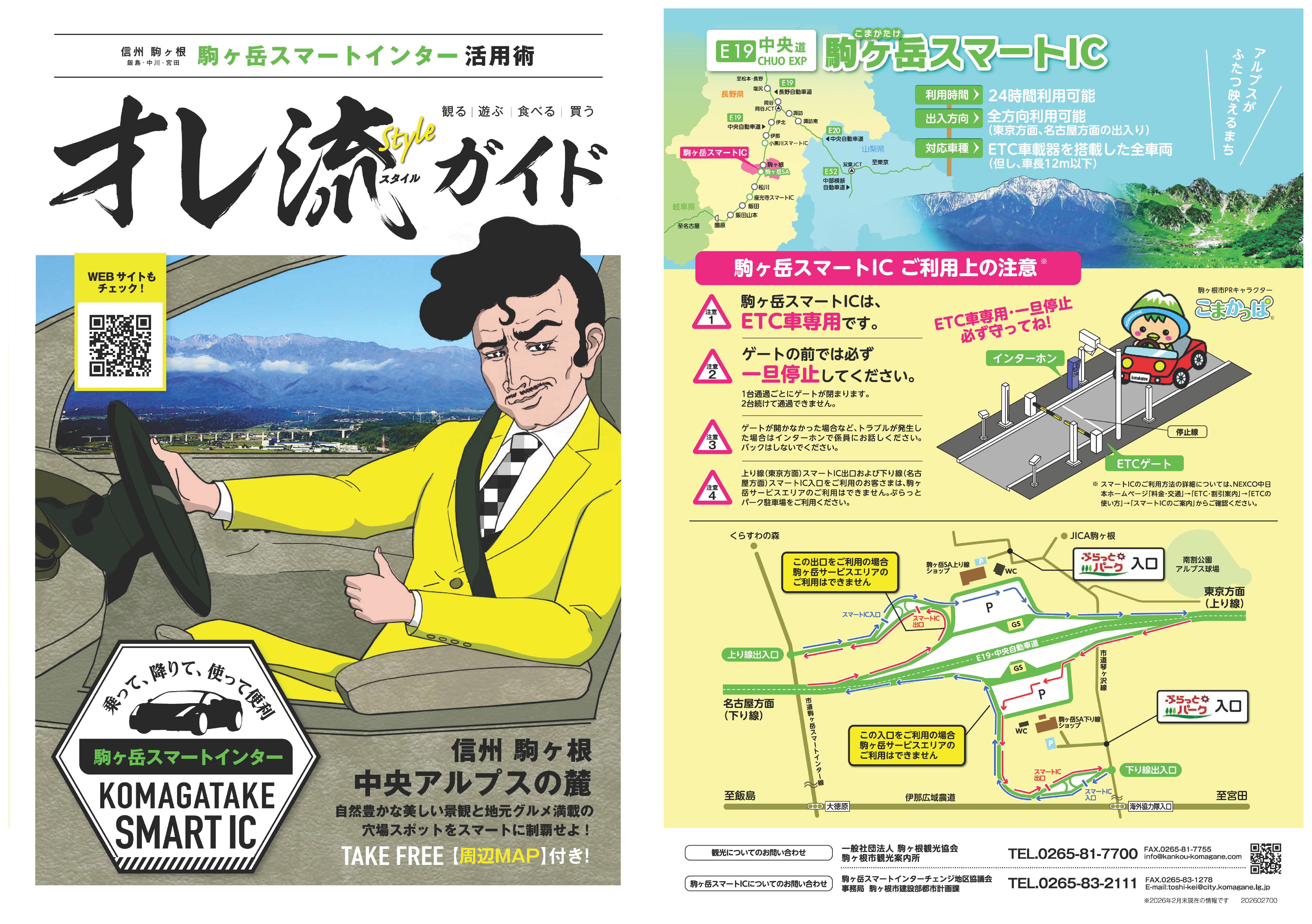 駒ヶ岳スマートインターチェンジをご利用ください 駒ヶ岳スマートインターチェンジの利用促進を図るため、駒ヶ岳スマートインターチェンジ地区協議会にて観光案内パンフレット~駒ヶ岳スマートインター活用術~『オレ流ガイド』を作成しました。 駒ヶ岳スマートインターチェンジを起点として、伊南地域のグルメやお土産処、アウトドアスポットなどを巡る旅の紹介をしています。ぜひご活用ください。 オレ流ガイド表紙・裏表紙(JPEG:2.5MB) オレ流ガイド2〜3ページ(JPEG:2.7MB) オレ流ガイド4〜5ページ(JPEG:2.6MB) オレ流ガイド6〜7ページ(JPEG:2.2MB) オレ流ガイド(全体) (PDFファイル: 9.6MB) この記事に関するお問い合わせ先 都市計画課 都市計画係〒399-4192長野県駒ヶ根市赤須町20番1号電話 0265-83-2111(代表) 内線521ファックス 0265-83-1278お問い合わせフォームはこちら 更新日:2026年03月23日