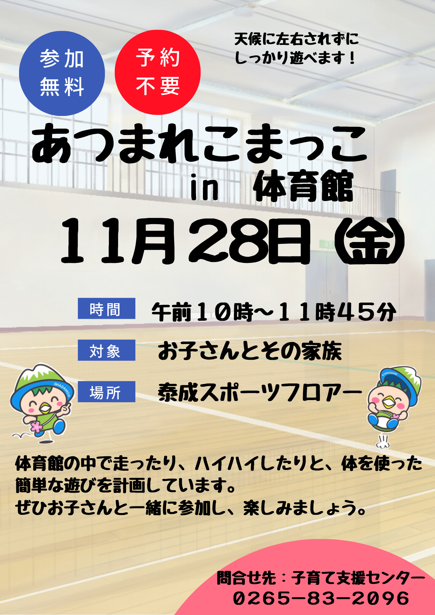 毎月アルプスドームで行っている体を使った楽しい運動遊びのイベント「あつまれこまっこ」を、泰成スポーツフロアーで行います。いつもの遊びを体育館で楽しめます。予約不要で、どなたでもご参加いただけます。